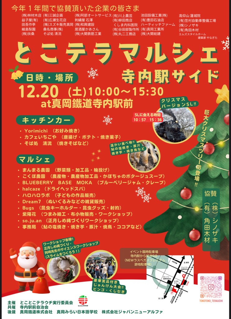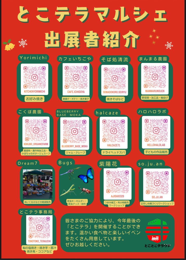第4回とこテラマルシェ開催のお知らせ 公開済み: 2025年12月2日更新: 2025年12月3日作成者: mokaカテゴリー: newsタグ: イルミネーション, クリスマス, クリスマスツリー, とこテラ, とこテラマルシェ, とことこテラウチ, マルシェ, ワークショップ, 収穫体験会, 寺内駅, 真岡グリーンツーリズム, 真岡鉄道 第4回とこテラマルシェを開催 寺内駅前で、イベントを開催します。 日時 令和7年12月20日(土曜日) 10時00分から15時30分まで 場所 寺内駅前(栃木県真岡市寺内) 内容 キッチンカー、マルシェブースの出店、ワークショップの開催など 他にもみんなで参加できるイベント多数開催中 寺内駅前に巨大なクリスマスツリーが飾られます! ←詳しくはインスタグラムをチェック 関連記事 10 6月4日(日曜日) 梨の摘果体験会を開催! 6月4日(日曜日) 梨の摘果体験会を開催! 市内の梨園にて、農業体験会を開催します! 体験内容は「梨の摘果体験」で、貴重な経験をすることができます! 8月には、梨の収穫体験も予定しておりますので、摘果体験か […] 公開済み: 2023年4月10日更新: 2023年7月5日作成者: mokaカテゴリー: news 22 夏を楽しむ!ブルーベリー狩りとお菓子作り教室を開催! 8月7日(木曜日) 夏を楽しむ!ブルーベリー狩りとお菓子作り教室を開催! BLUEBERRY BASE MOKAでブルーベリー狩りを行い、その採れたてのブルーベリーを使ったお菓子作り教室を開催 […] 公開済み: 2025年7月22日更新: 2025年7月22日作成者: mokaカテゴリー: newsタグ: BLUEBERRYBASE, グリーンツーリズム, 真岡市 10 いちごの就農体験会を開催! いちごの就農体験会を開催! 市内のいちご農家で農業体験会を開催します! 体験内容は「いちごの就農体験」で、いちご苗の定植から収穫までを一貫して体験できるものとなり、就農を検討して […] 公開済み: 2025年9月10日更新: 2025年9月10日作成者: mokaカテゴリー: newsタグ: いちご, いちご農家, グリーンツーリズム, 収穫体験会, 就農体験, 真岡市, 苺